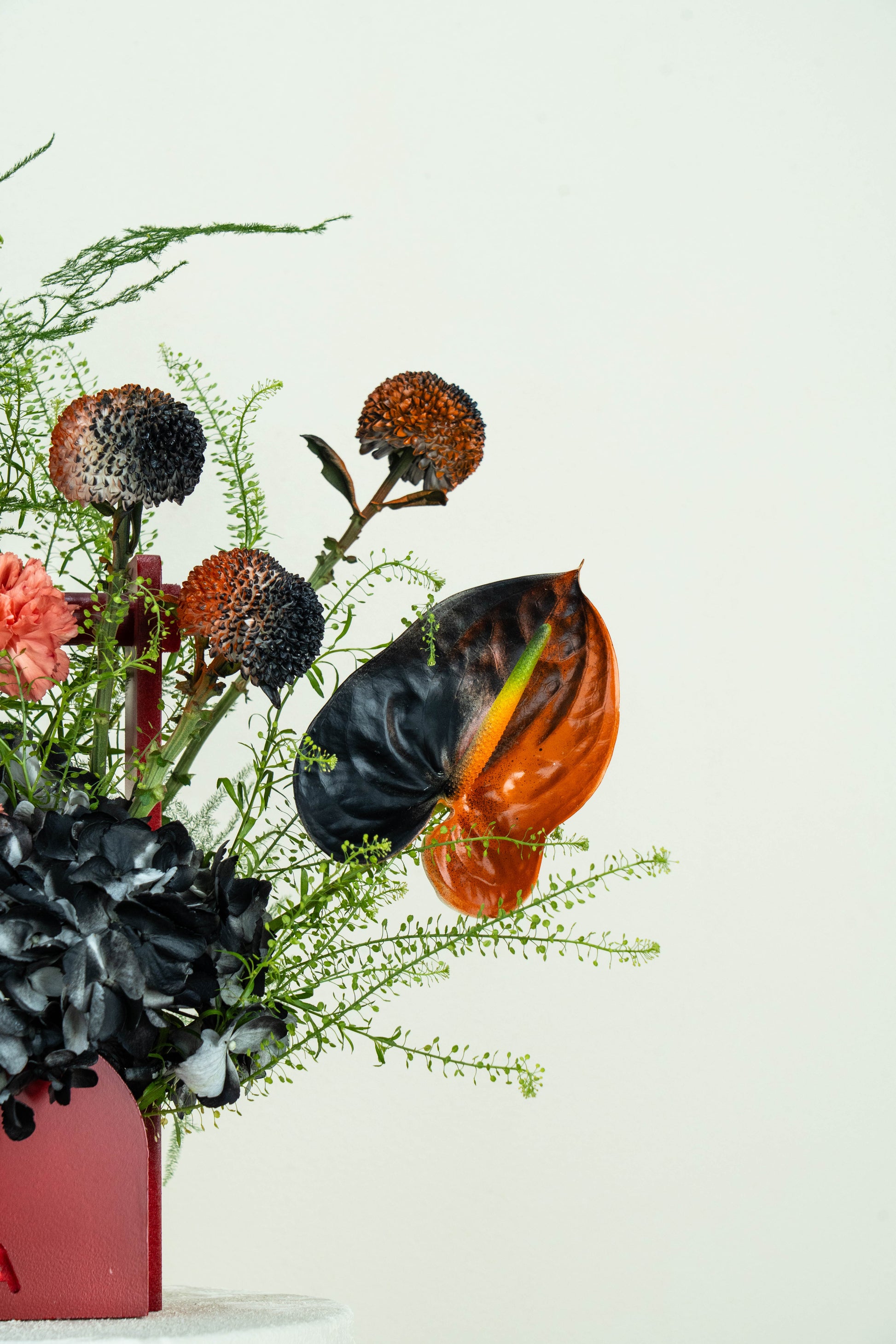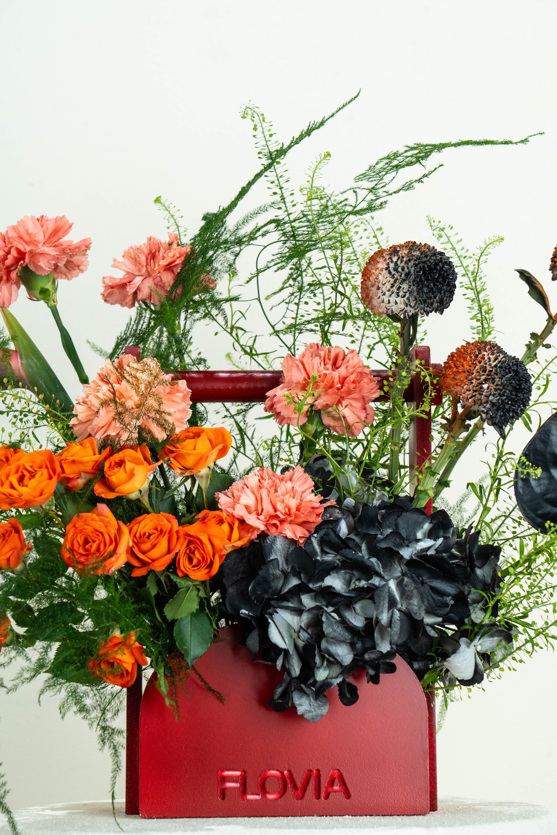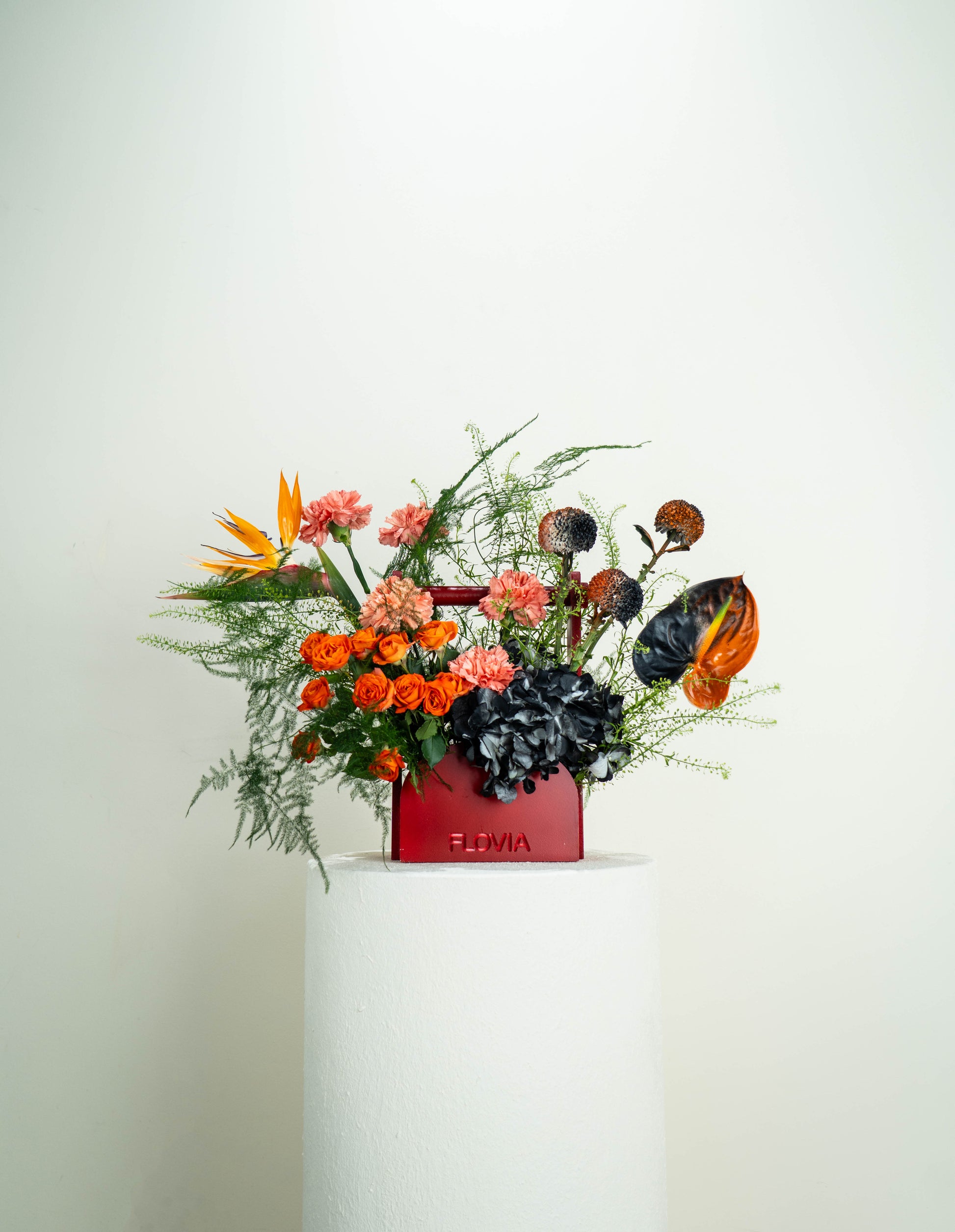 Crafted in a bold red Flovia box, this design features black hydrangeas, deep orange spray roses, coral carnations, Birds of Paradise, and eerie dried accents, perfectly balanced with lush greenery.