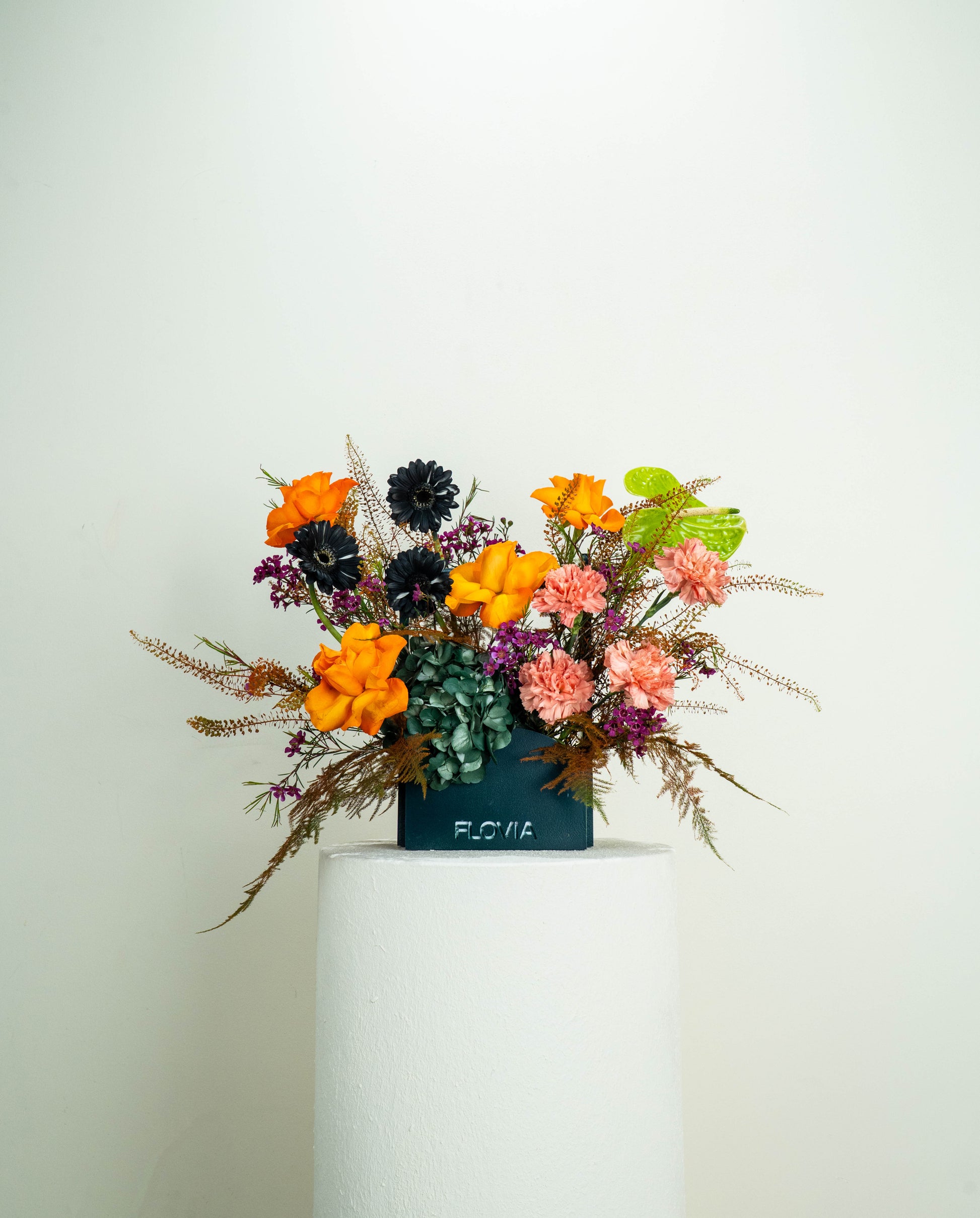 This handcrafted floral arrangement blends the warmth of golden marigolds and peach carnations with the deep mystery of dark blooms, symbolizing balance between light and shadow. Perfect for modern interiors, heartfelt gifts, or artistic displays.