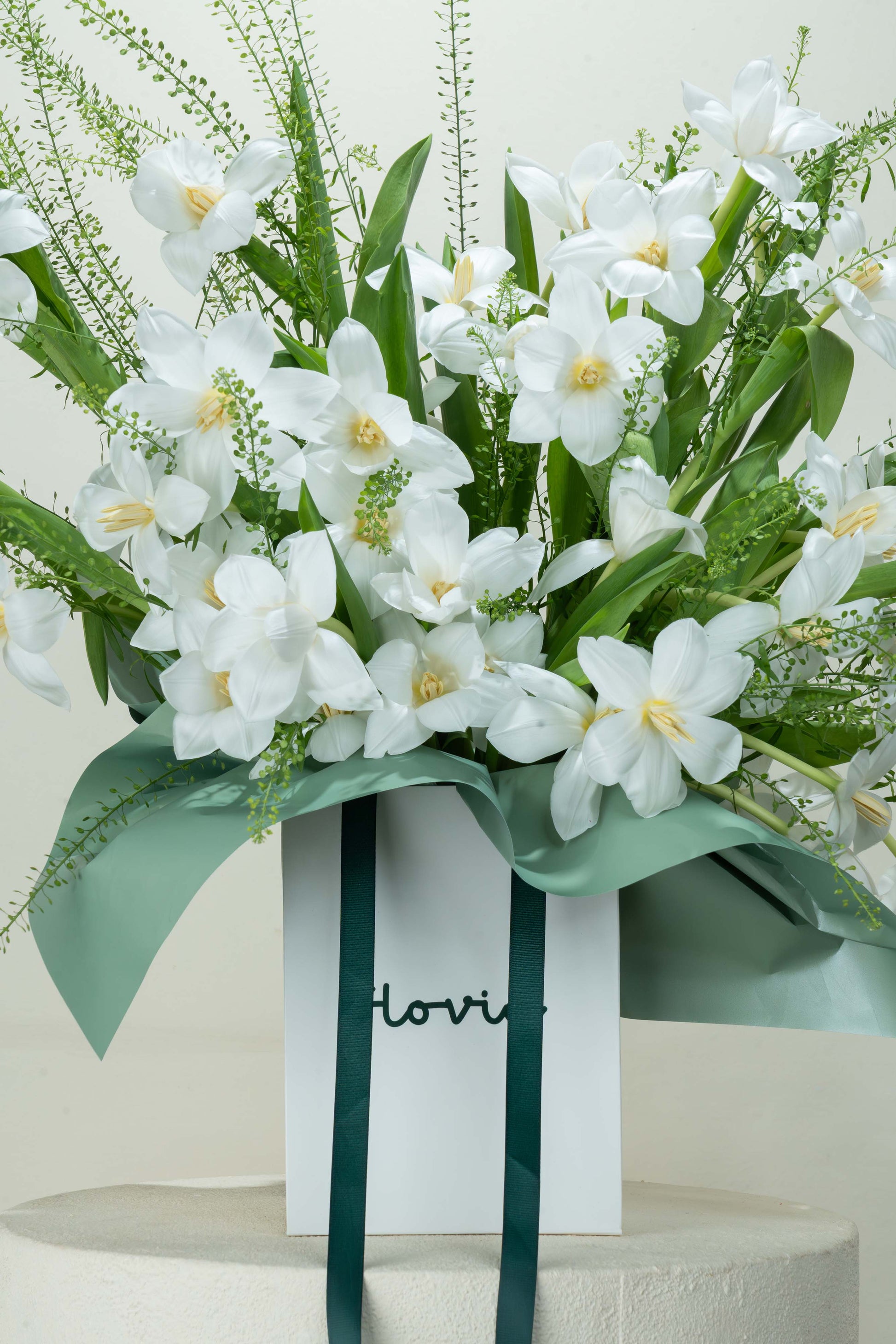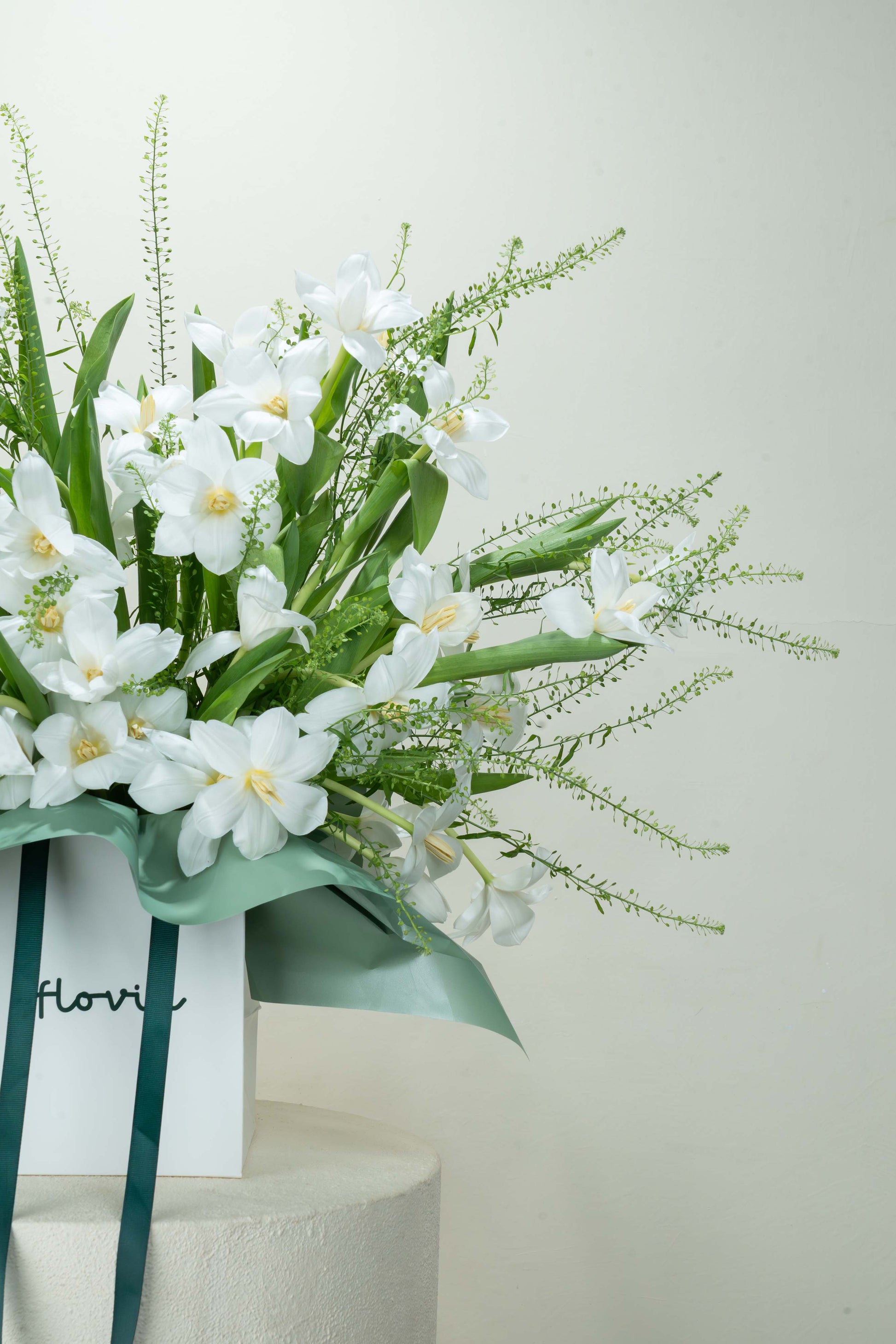 Experience the essence of elegance with our Snow Lily Luxe, a handcrafted arrangement featuring premium white flowers paired with lush, fresh greenery. Designed in Flovia’s signature luxury gift bag, this arrangement brings a touch of purity and sophistication to any space.
