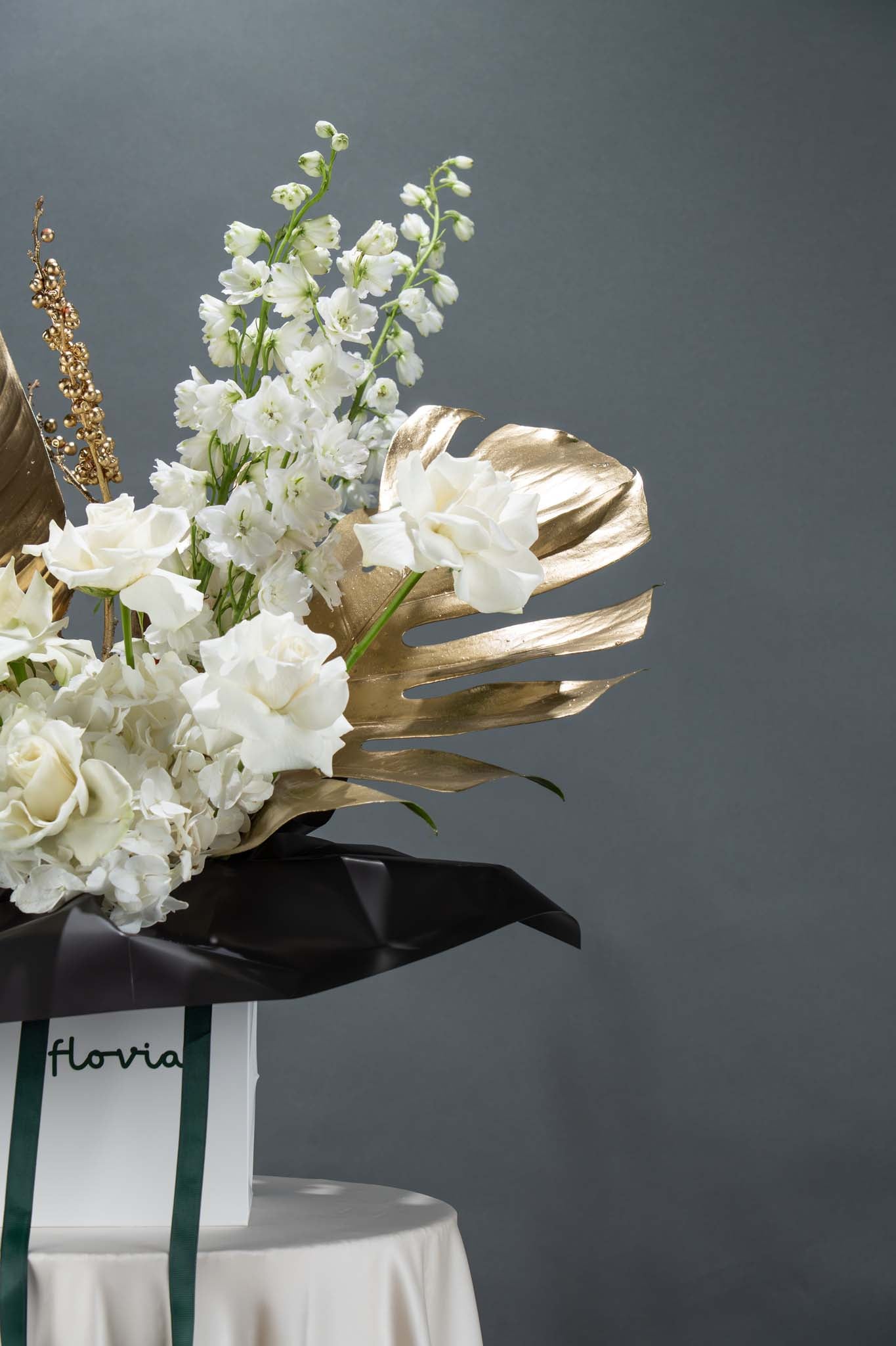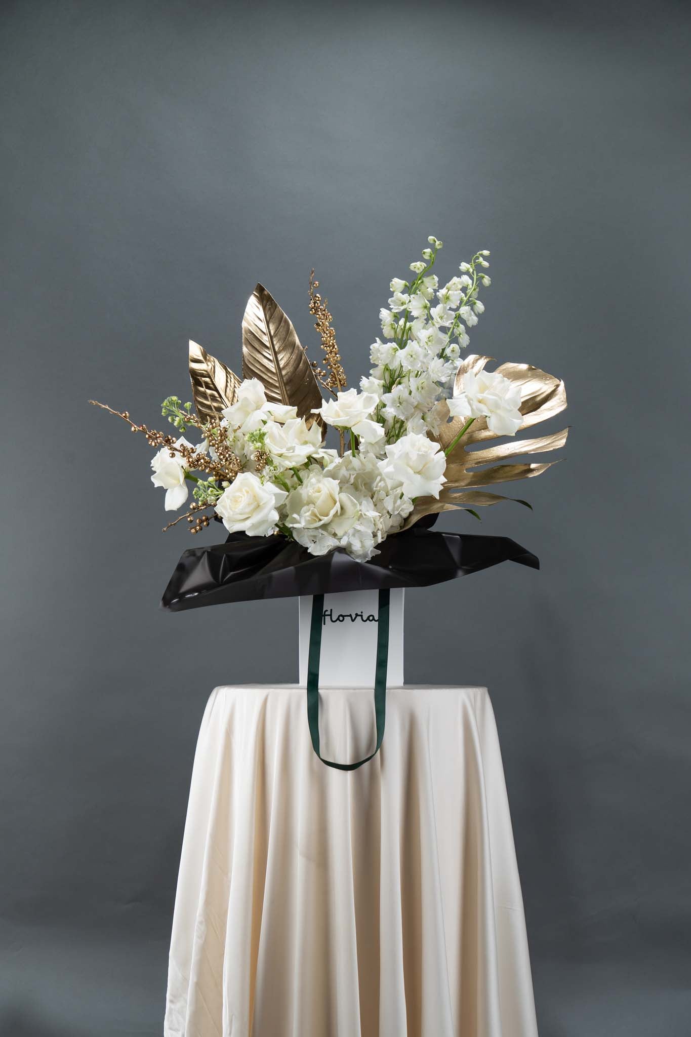 Finished with premium wrapping and sturdy designer handles, this arrangement blends contemporary style with long-lasting beauty. Whether you’re sending a thoughtful gift or elevating an event space, Snowfall Luxe delivers understated luxury and unforgettable charm.