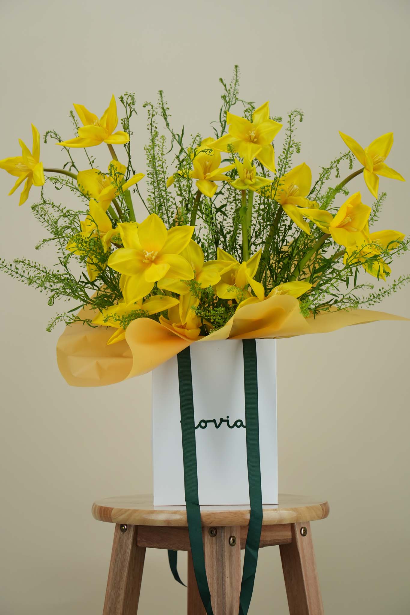 Add a touch of brightness to any moment with this elegant arrangement of fresh yellow flowers beautifully presented in a stylish gift bag. Designed with vibrant seasonal blooms and natural greenery, this floral arrangement creates a cheerful and refreshing display. The lively yellow flowers symbolize happiness, positivity, and warmth, making this arrangement a wonderful choice for birthdays, celebrations, thank-you gifts, or simply to surprise someone special. Carefully handcrafted by skilled florists, this arrangement combines freshness, color, and elegance, making it a perfect floral gift that brings joy and beauty to any space.