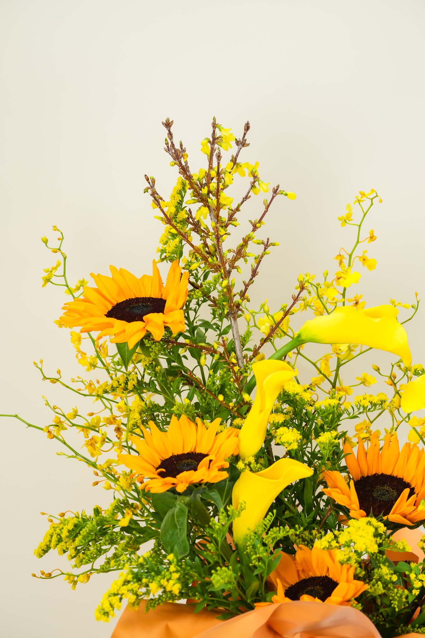 Sunshine Harvest is a vibrant floral arrangement designed to express warmth, positivity, and celebration. This design features bold sunflowers paired with elegant yellow calla lilies, complemented by seasonal yellow fillers and fresh greenery. The sunflowers create a strong visual focal point while the calla lilies introduce a refined and modern touch.